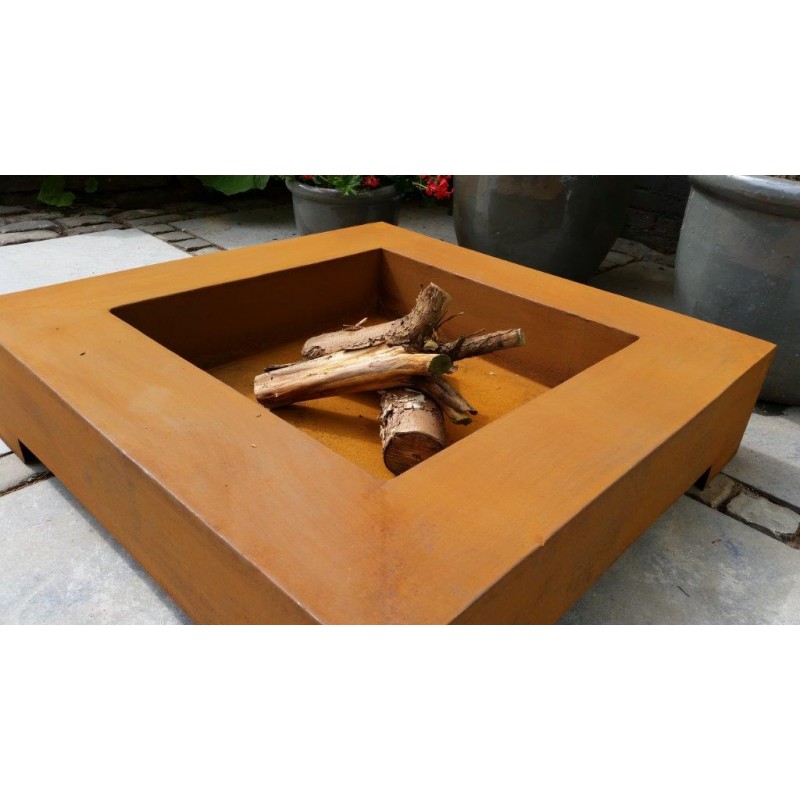 Diese viereckige Feurschale The Square gerfertigt aus 2 mm Cortenstahl erhält nach einiger Zeit die typische braunorange Rostfarbe.