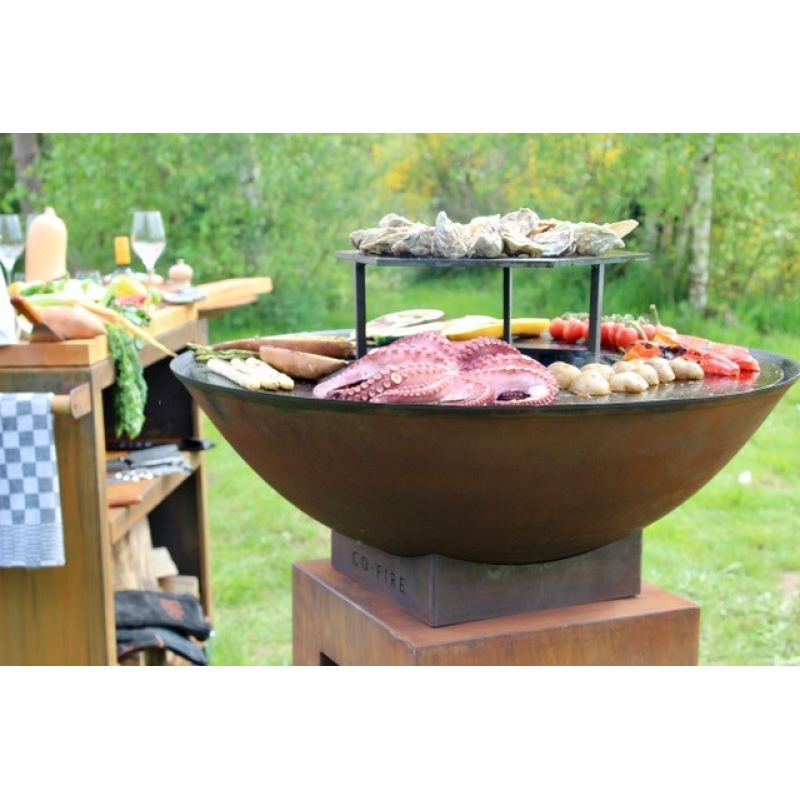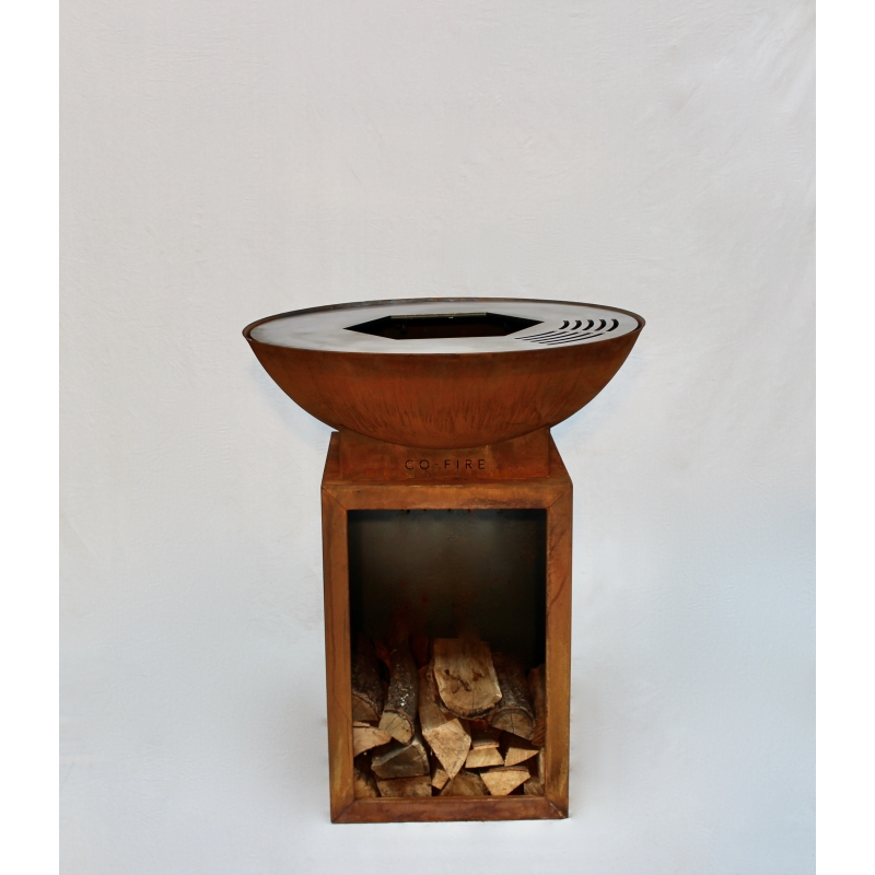 Der Woodstock PRO ist eine robuste Cortenstahl Säule mit einem 5 cm dickeren Rand, Oberfläche 48x48 cm und ist durch seine Höhe von 70 cm ideal zum stehenden Kochen. Man kann darin auch das nötige Brennholz schlichten oder andere Zubehöre aufbewahren.
