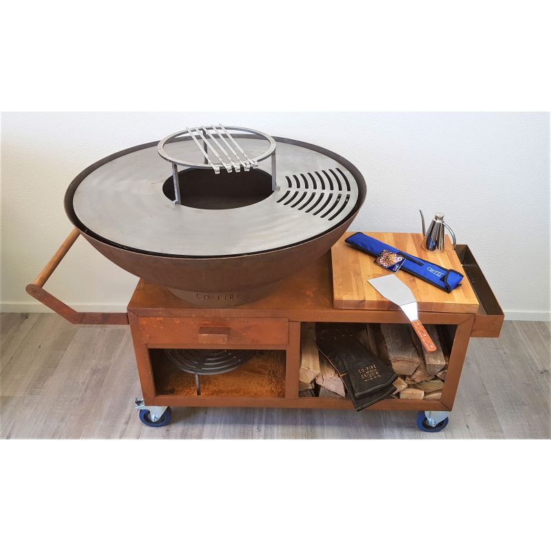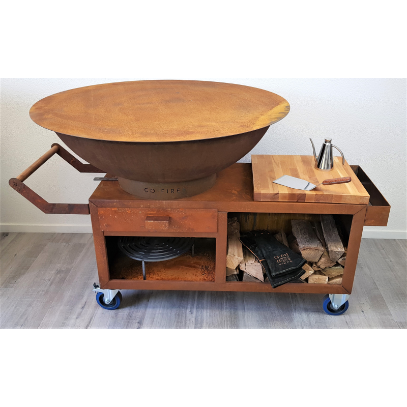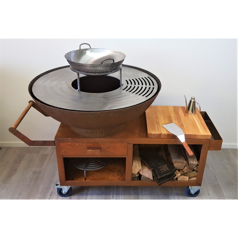 The Mobile can be used private and also for professional use and provides all the possibilities for cooking a professional meal for your guests. The Mobile is compact and movable so you can easily use it wherever you need it. There is room to place all your cooking accessories, wood, plates, food, herbs, towel etc. and a cutting block of solid ashwood.