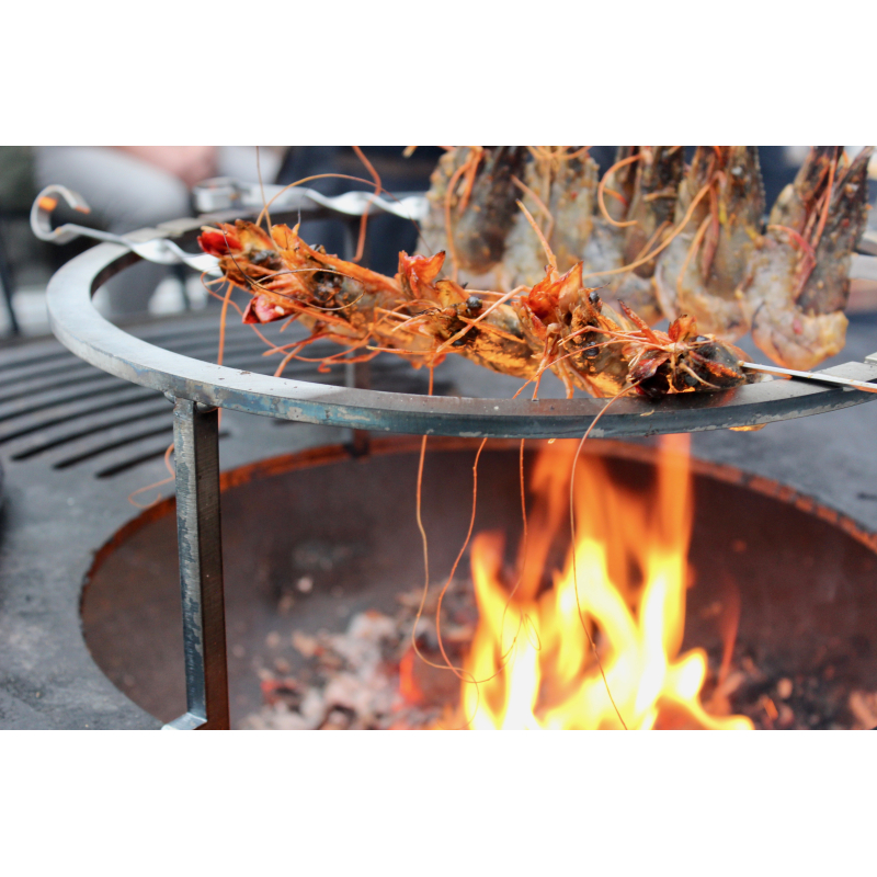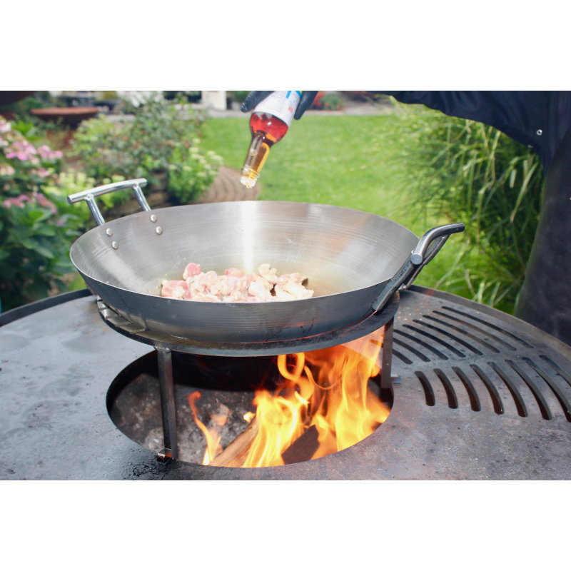 The GrillRing is made of high quality 10 mm hardened steel. The steel by heat treatment is made stress-free, so the chance of warping is minimized. This makes the surface robust and scratch resistant. The ring ‘floats’ in the bowl, so that excessed fat indirectly drops into the bowl. The distance to the edge of the bowl also allows air supply into the bowl, so that the flames can develop completely. The Grill Ring is adjustable in height if desired. The GrillRing 100 BBQ can be ordered with grill opening allowing your meat, fish or vegetable to get the ' striping ' and special high culinary wood flavour.