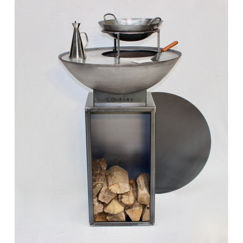 The Woodstock 40x40x75cm made of 3mm Corten steel provides you with the possibility to stock wood an brings the GrillRing-Set up to the desired sit- or standing height.