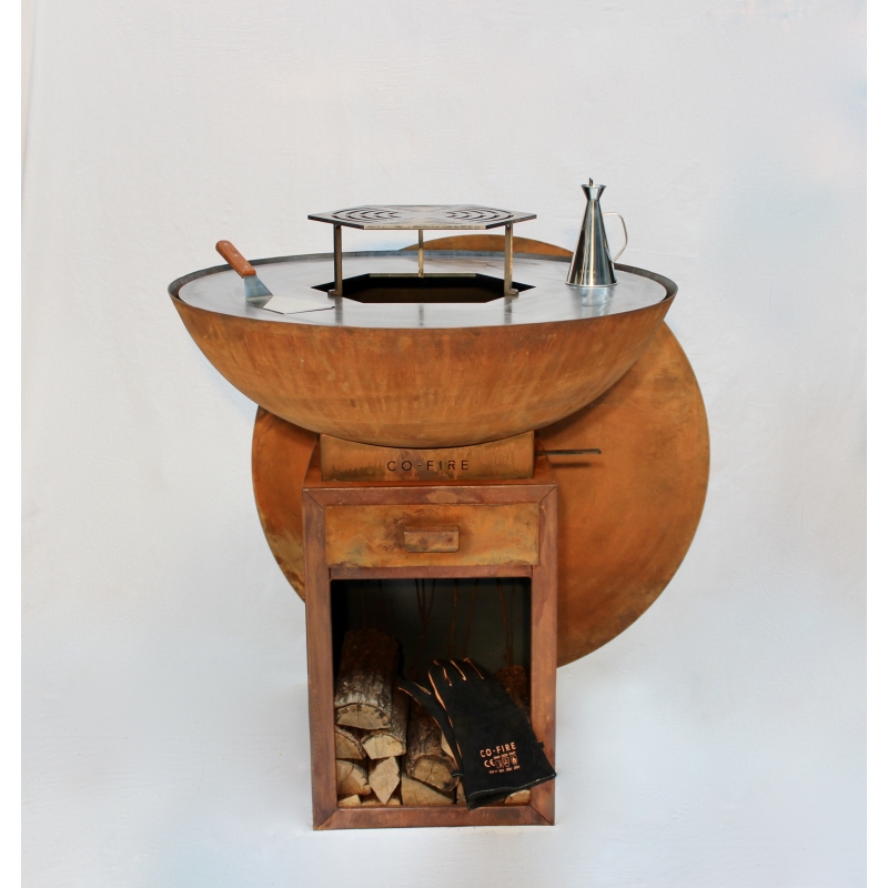 The Woodstock PRO+ with its rough look is made from Corten steel 48x48x70cm has a height of 70 cm. Perfect for outdoor cooking and you can not only store wood, but also other supplies needed for cooking nearby.