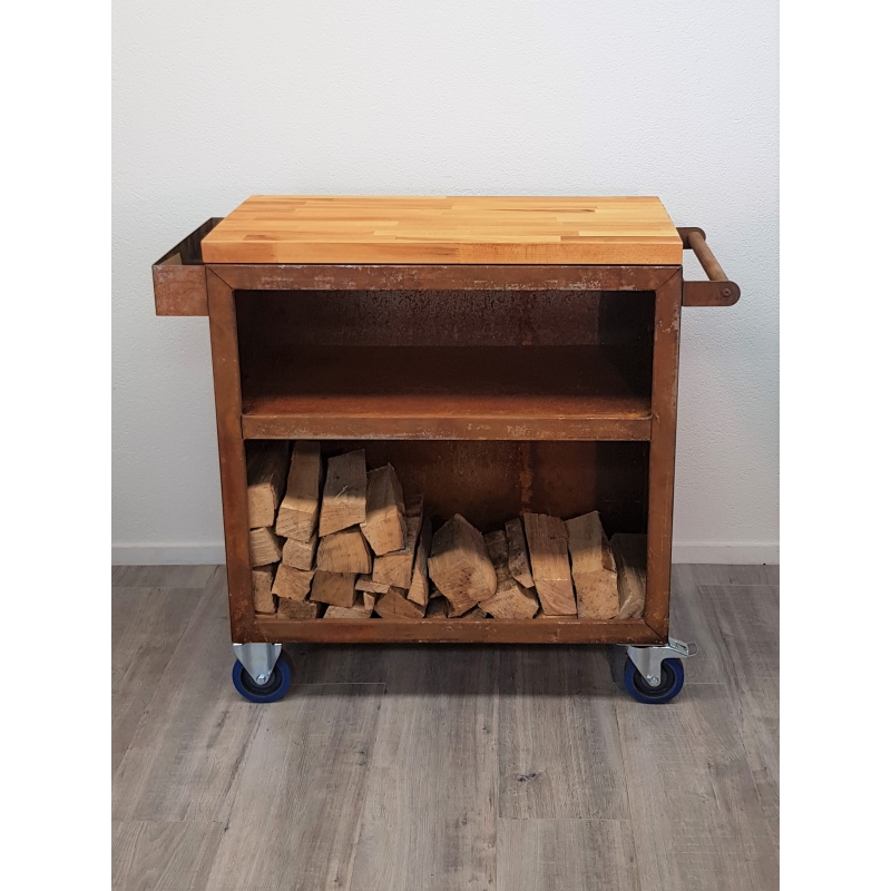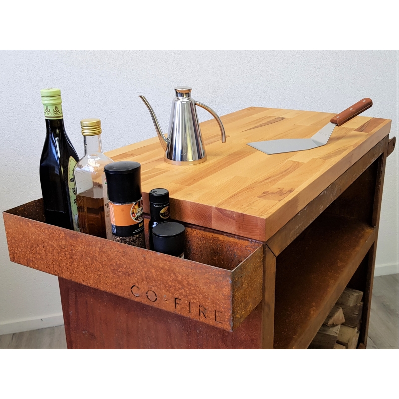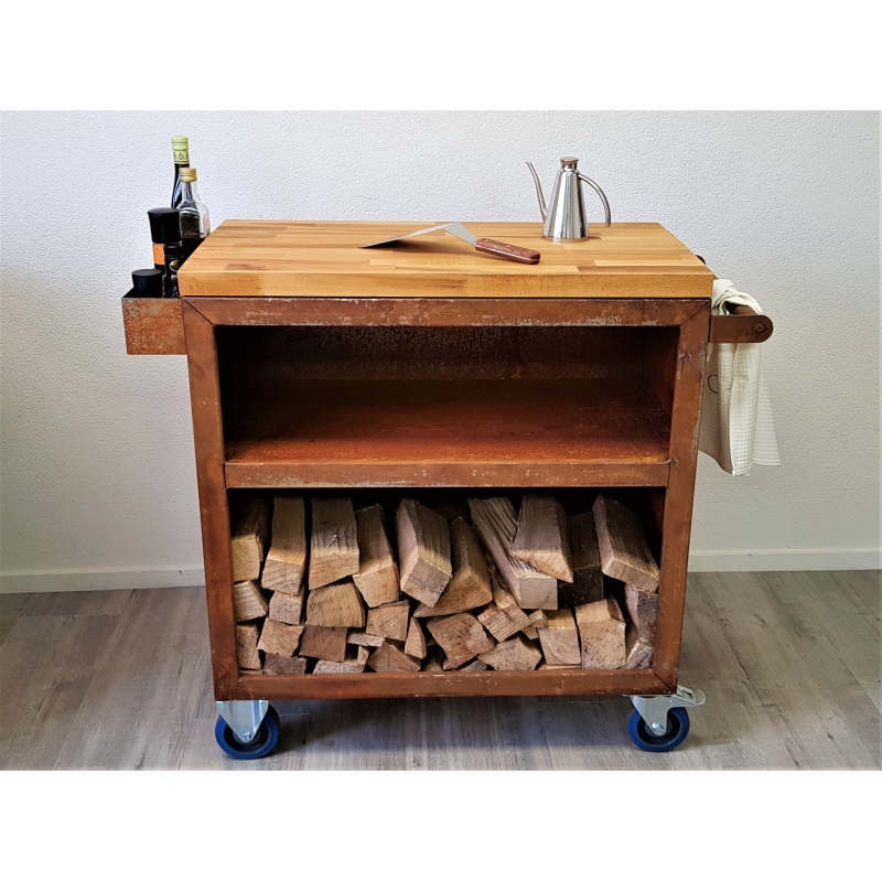 The Workmade is, as the name suggests, made to work. The corten steel Workmade can be moved around so you always have your cutting board at hand. The Workmade is equipped with a tray to easily store your herbs, oils, sauces and others. There is also the opportunity to hang your hand-/teatowel on the side of the Workmade. Are you left or right-handed? The connector of the tray or towel carrier is on both sides universal.