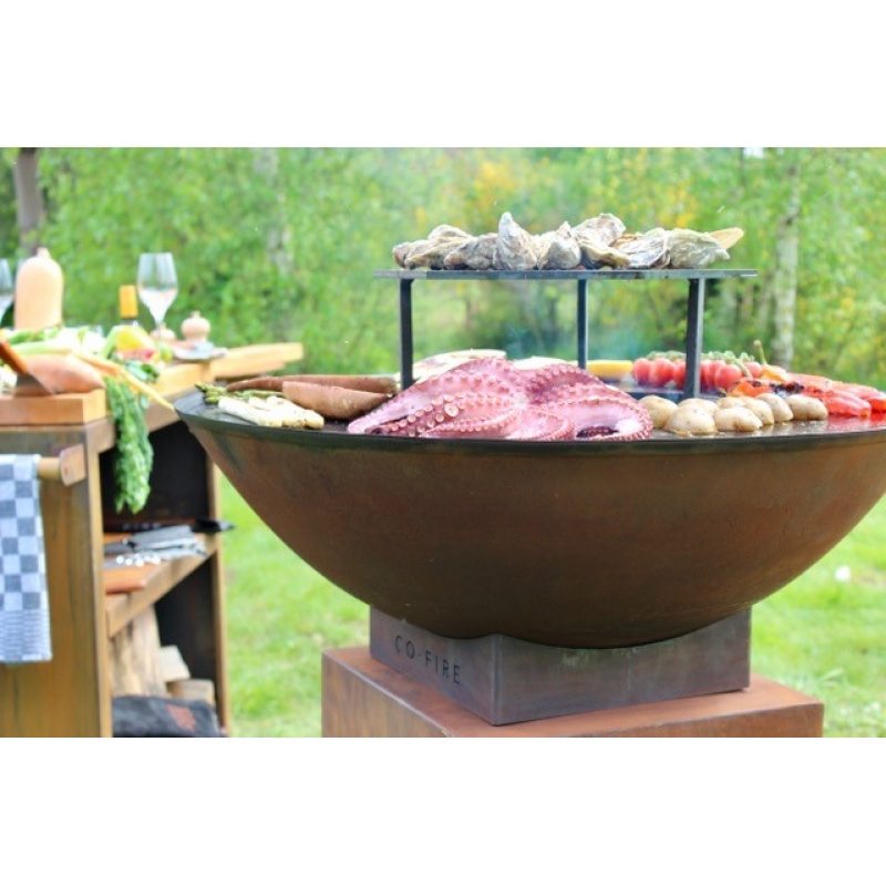 De Cortenstalen ringen vierkant met Co-Fire Logo gemaakt voor de gietijzeren schalen geeft de nodige stabiliteit en maakt het mogelijk de schaal in een schuine positie te plaatsen.